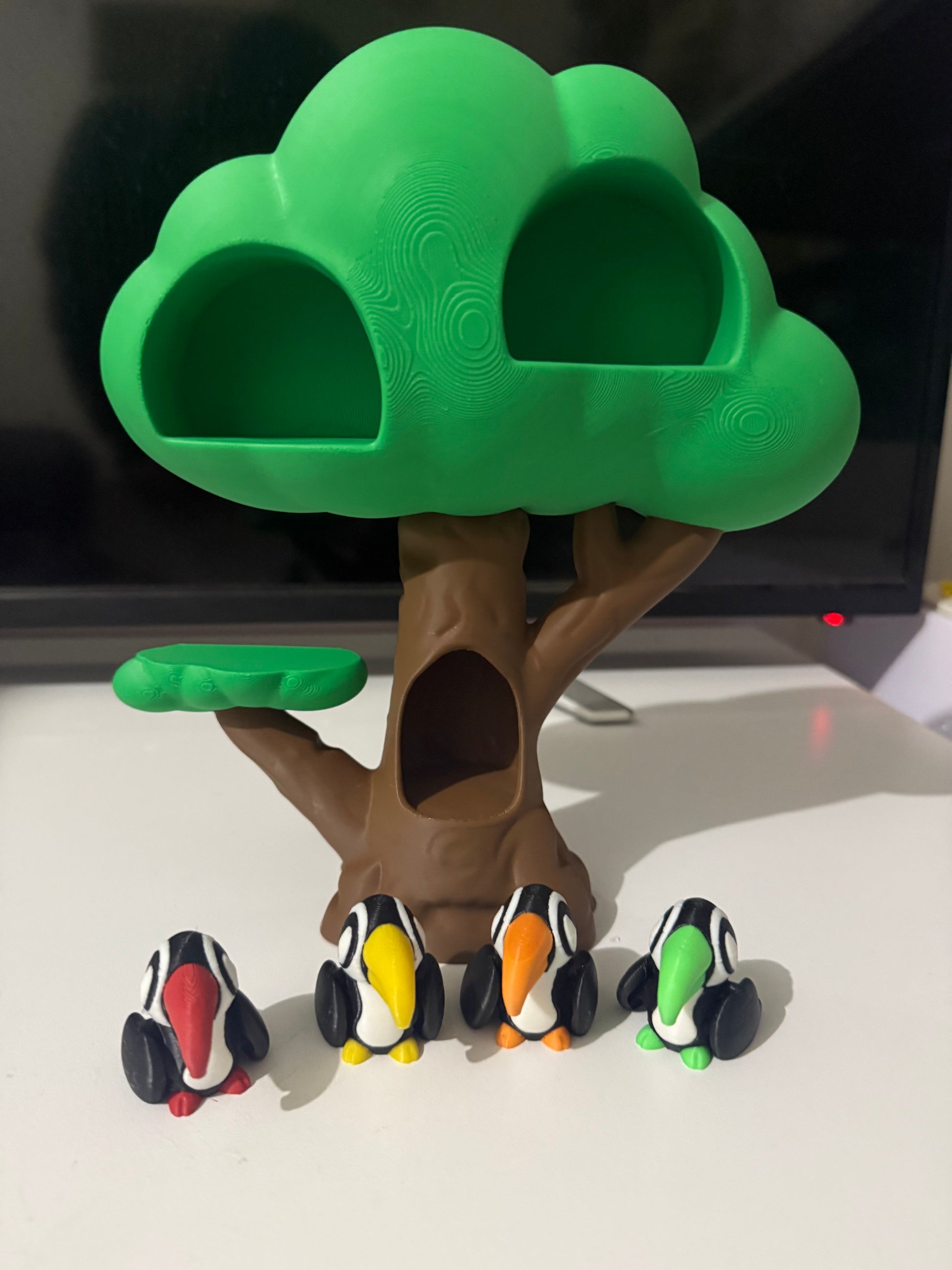 This vibrant scene features a towering jungle tree habitat home to four colourful articulated Toucans, each with smooth, flexible motion and its own unique shade. Together, they bring a burst of tropical personality and movement to your collection — a celebration of colour and creativity from every angle.