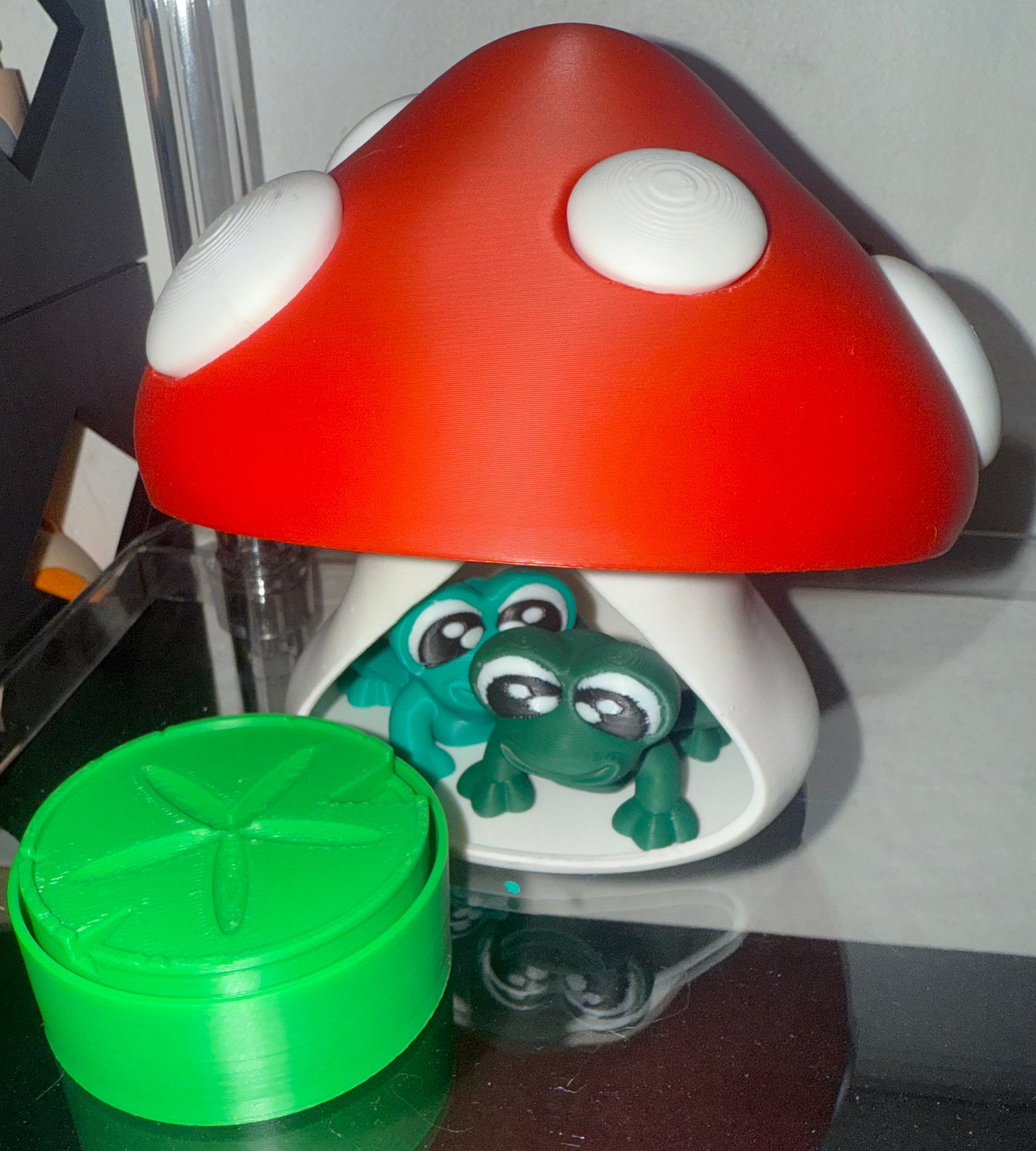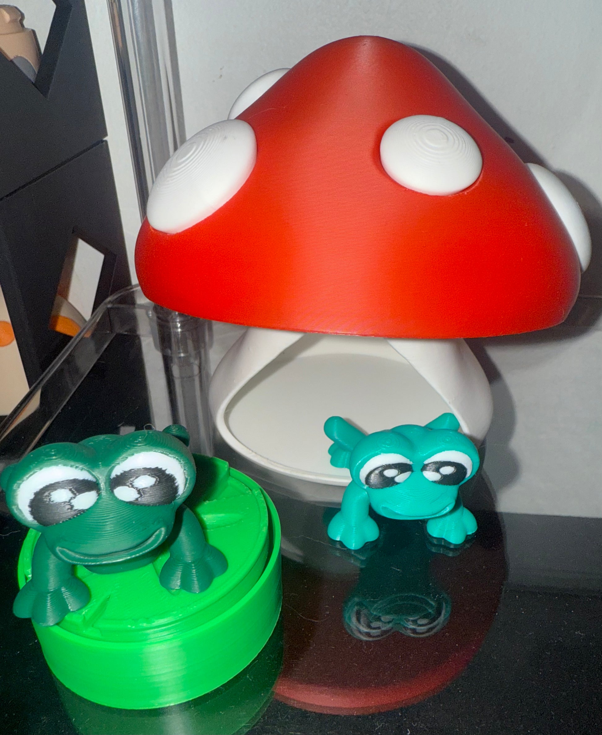 Hidden beneath the toadstools, two friendly articulated Frogs and their Lily Pad Clicker make their cozy home. Each frog flexes and moves with smooth, lifelike motion, while the clicker adds a playful splash of pond-side fun.