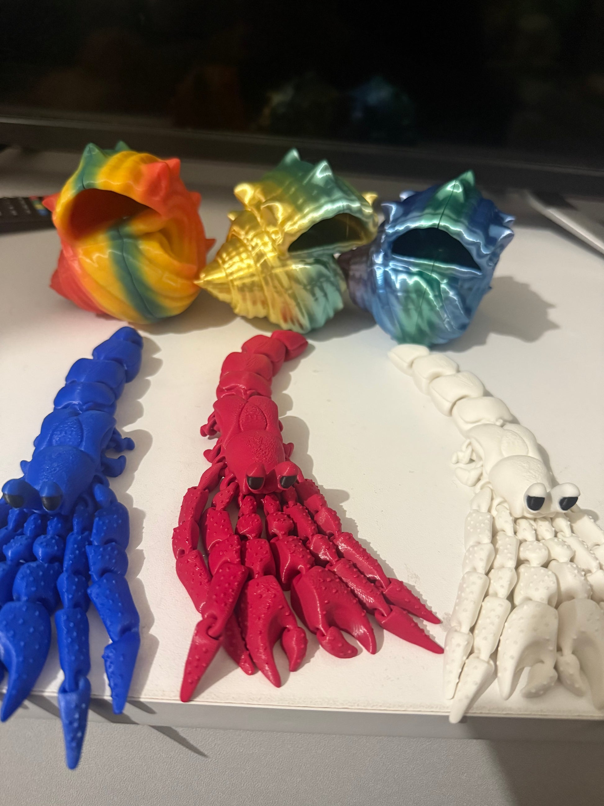Each crab is 3D printed with smooth, flexible joints for endless fidgety fun and easy posing. The shells are usually made using rainbow, gradient, dual, or tri-coloured filament fills, meaning each one is completely unique — colours may vary slightly from photos depending on where the filament roll is up to during printing.