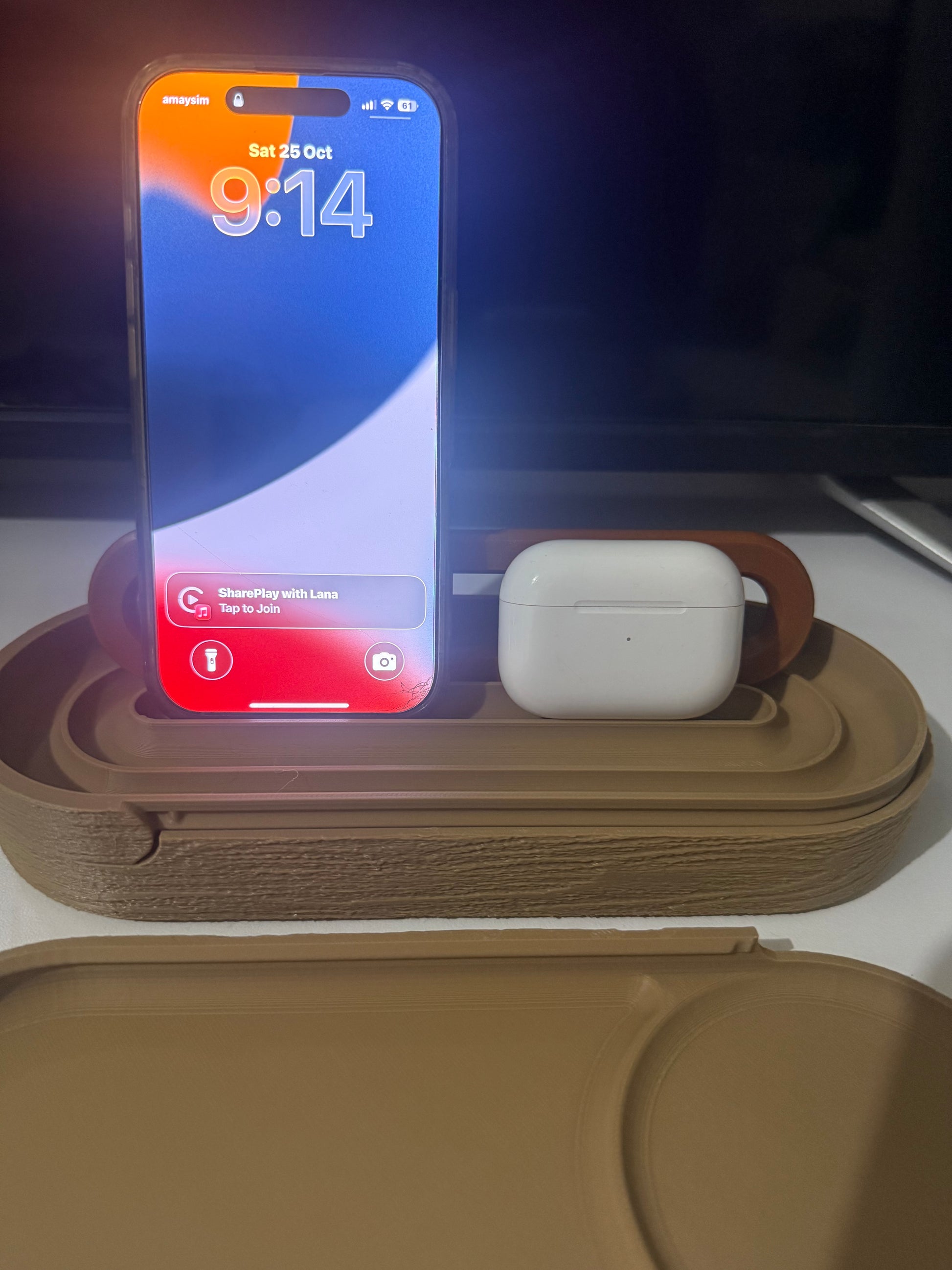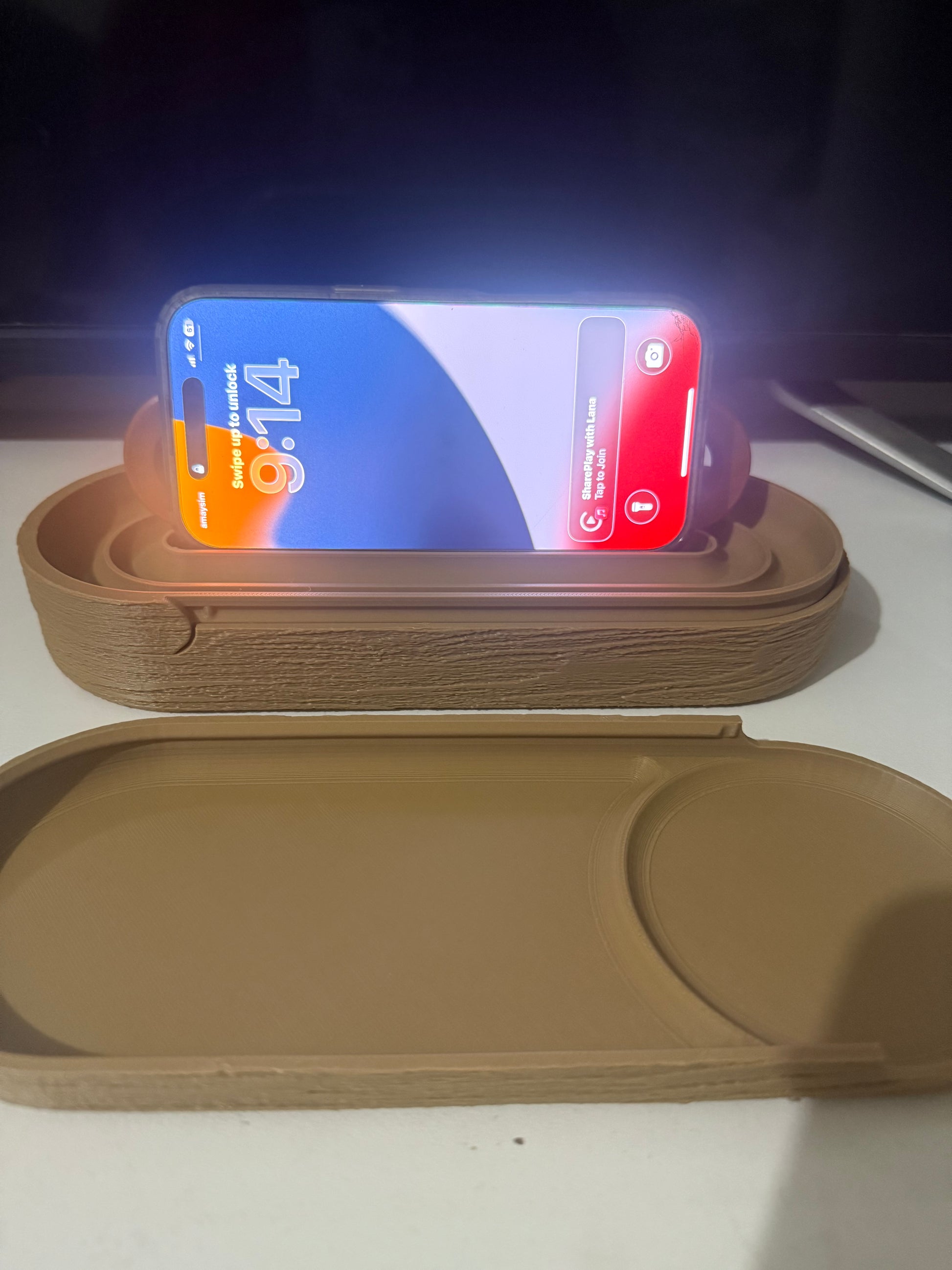 - And a middle tray with a handle that cleverly doubles as a phone stand 📱